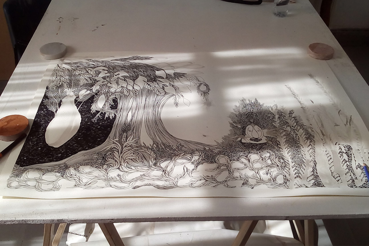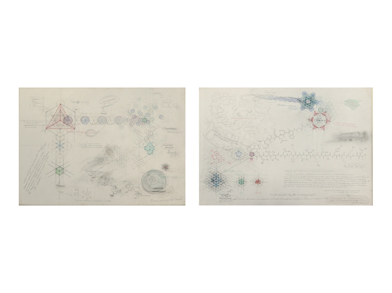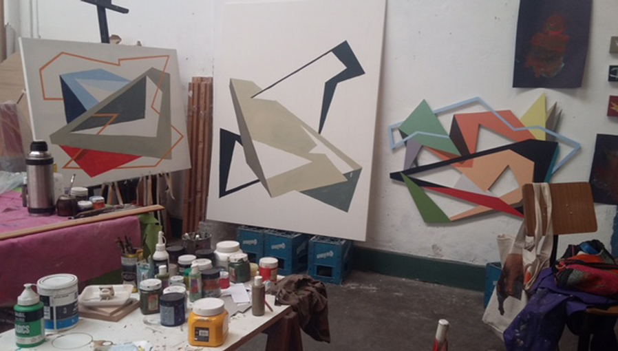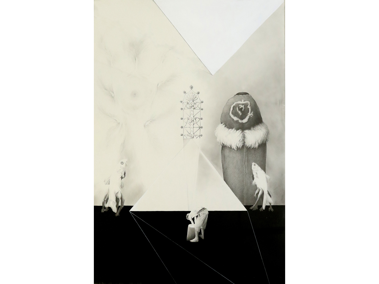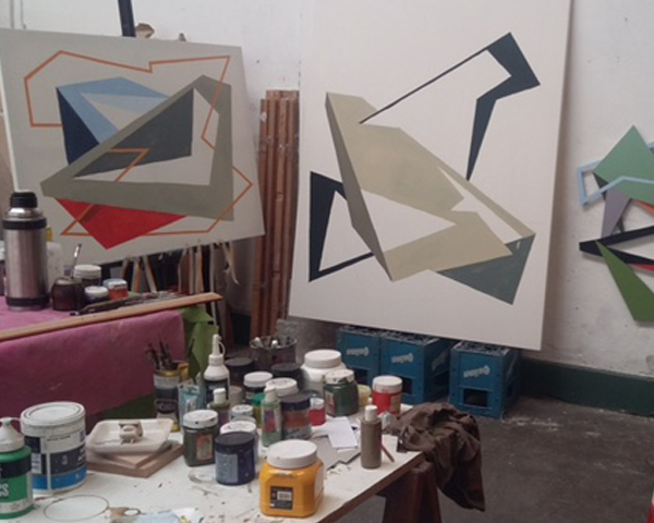 Identificando las irregularidades de los fractales como enigma, realiza pinturas geométricas donde busca blancos desafiantes y negros profundos. El contraste primitivo y el silencio de los planos negros lo hipnotizan. Surge en esa profundidad el aura de un insecto inmóvil, lo inventa en un papel o una tela, piensa sus formas, texturas, brillos, opacidades, matices y lo deja que, como cualquier organismo vivo, se camufle según su entorno.