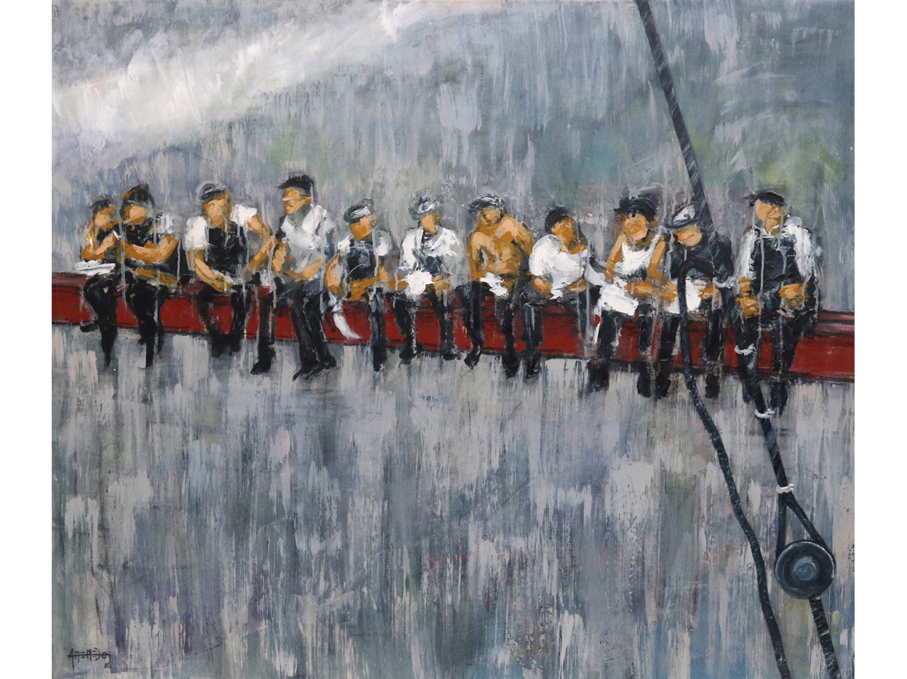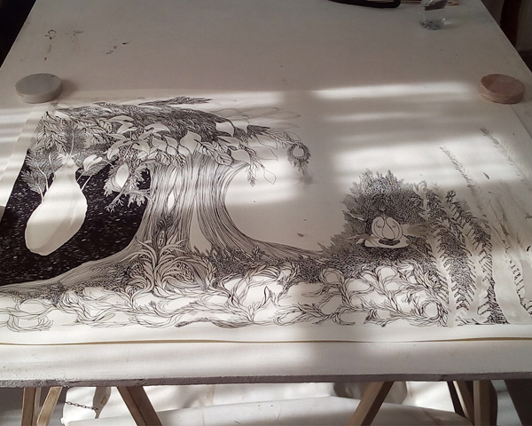 En esta obra hay también símbolos y piedras negras. Una piedra que esta fría se posa en el borde del boceto. Esta fría pero emana calor, opera en silencio sin que nadie la vea, lenta, sigilosa y precisa.